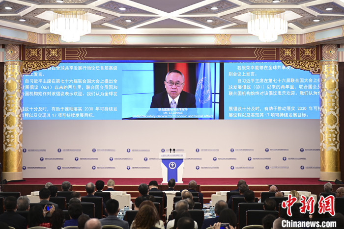 7月10日,全球共享發(fā)展行動(dòng)論壇首屆高級(jí)別會(huì)議在北京開(kāi)幕。聯(lián)合國(guó)副秘書(shū)長(zhǎng)李軍華在開(kāi)幕式作視頻致辭時(shí)指出,實(shí)施2030年可持續(xù)發(fā)展議程的時(shí)間框架已過(guò)半,但只有約12%的可持續(xù)發(fā)展目標(biāo)有望在2030年之前實(shí)現(xiàn),聯(lián)合國(guó)呼吁各會(huì)員國(guó)加大投入,為有需要的國(guó)家增加可負(fù)擔(dān)的長(zhǎng)期發(fā)展融資。 中新社記者 田雨昊 攝