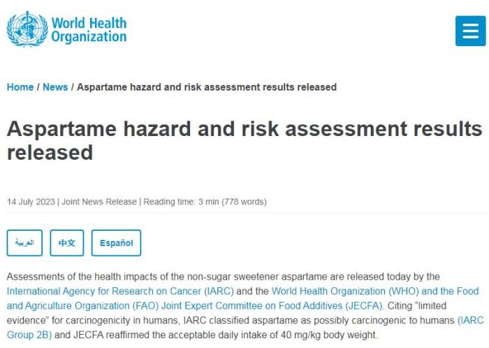 消息稱,IARC 和JECFA兩個機構(gòu)進行了獨立但互補的審查,以評估與使用阿斯巴甜相關(guān)的潛在致癌危害和其他健康風(fēng)險。