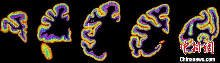 圖為不同類型細胞在獼猴大腦上的分布切片。 中國科學(xué)院腦科學(xué)與智能技術(shù)卓越創(chuàng)新中心 供圖