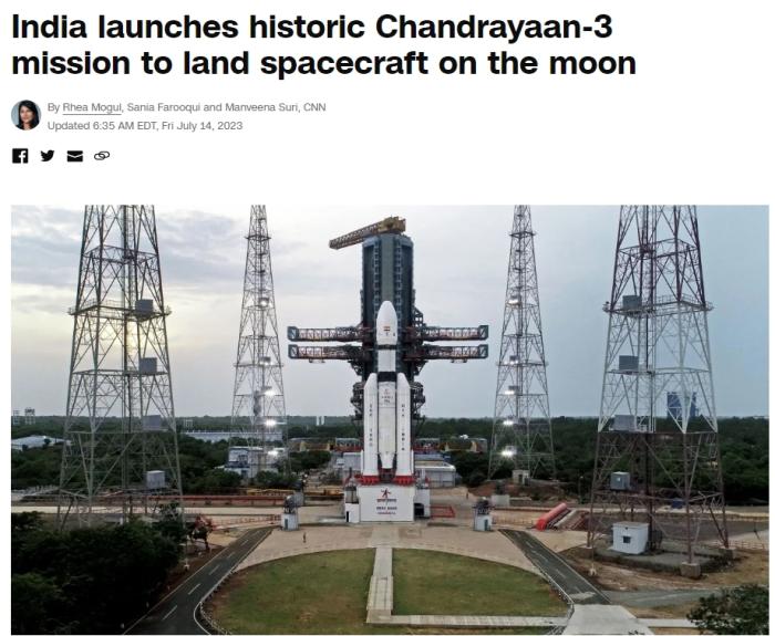 中新網(wǎng)7月14日電 據(jù)美國(guó)有線電視新聞網(wǎng)(CNN)報(bào)道,當(dāng)?shù)貢r(shí)間14日下午,印度“月船3號(hào)”月球探測(cè)器發(fā)射升空。報(bào)道稱,如果該月球探測(cè)器8月著陸成功,印度將成為第4個(gè)在月球表面軟著陸的國(guó)家。