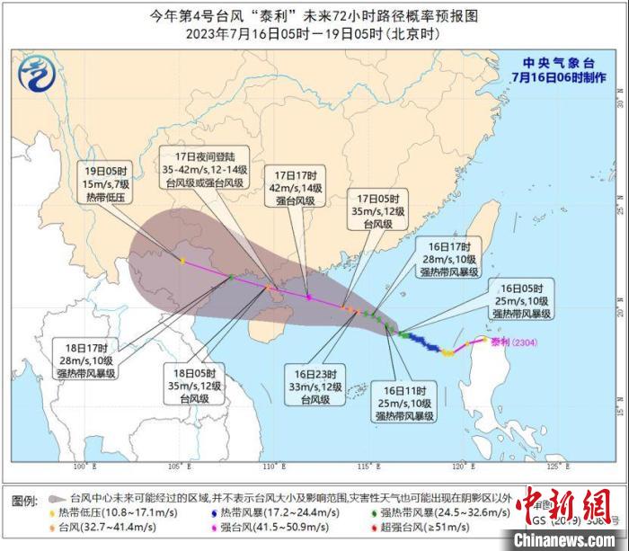 臺(tái)風(fēng)“泰利”未來72小時(shí)路徑概率預(yù)報(bào)圖?!≈醒霘庀笈_(tái)制圖
