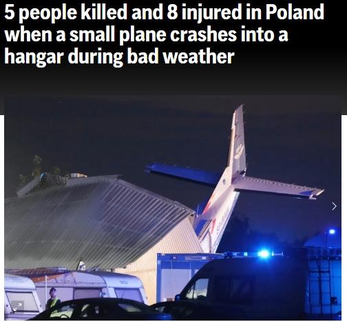 據(jù)報(bào)道,當(dāng)天,波蘭國家消防局發(fā)言人莫妮卡·諾瓦科斯卡·布林達(dá)(Monika Nowakowska-Brynda)表示,“波蘭中部的克辛諾(Chrcynno)地區(qū),受惡劣天氣影響,一架塞斯納型飛機(jī)在降落時(shí)墜入跳傘中心的機(jī)庫,事發(fā)時(shí)有10人在機(jī)庫中,飛行員和在機(jī)庫中躲避暴風(fēng)雨天氣的4名人員遇難?!?/p>
