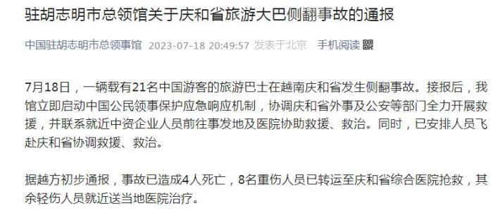中新網(wǎng)7月18日電 據(jù)中國駐胡志明市總領(lǐng)事館微信公眾號18日消息,7月18日,一輛載有21名中國游客的旅游巴士在越南慶和省發(fā)生側(cè)翻事故。