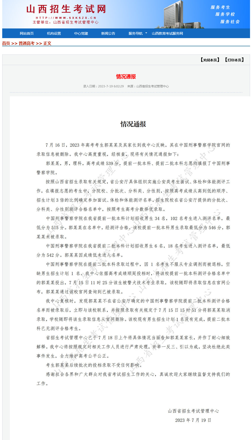 中新網(wǎng)7月19日電 據(jù)山西招生考試網(wǎng)消息,山西省招生考試管理中心19日發(fā)布情況通報(bào)稱,7月16日,2023年高考考生郭某某及其家長(zhǎng)到該中心反映,其在中國(guó)刑事警察學(xué)院官網(wǎng)的錄取信息被刪除。該中心高度重視,經(jīng)核查,有關(guān)情況如下:
