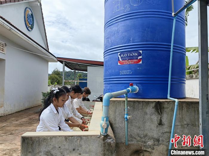 2023年6月,俄勒塞村小學(xué)的學(xué)生正在使用凈水系統(tǒng)?!≈行律缬浾?楊強(qiáng)攝