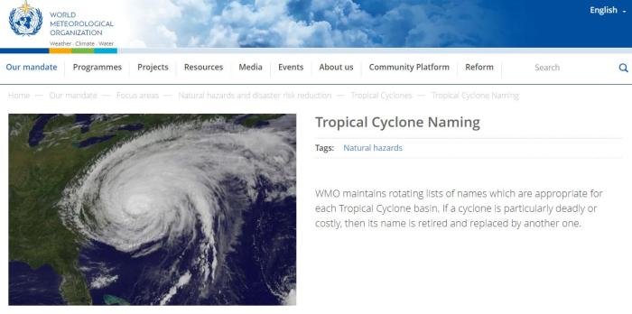 從20世紀(jì)起,美國(guó)聯(lián)合臺(tái)風(fēng)警報(bào)中心開始對(duì)臺(tái)風(fēng)命名。最初,這一機(jī)構(gòu)用女性英文名對(duì)臺(tái)風(fēng)進(jìn)行命名,后來(lái)又增加了男性英文名,并與女性名字交替使用。