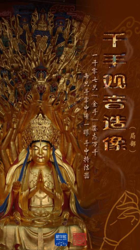 走近看,這座造像頭頂和兩側(cè),孔雀開屏般放射狀地浮雕著1007只“金手”。造像手中的法器展現(xiàn)了古代人民的生活用具、勞動(dòng)工具以及戰(zhàn)爭(zhēng)武器,有著重要的歷史價(jià)值。