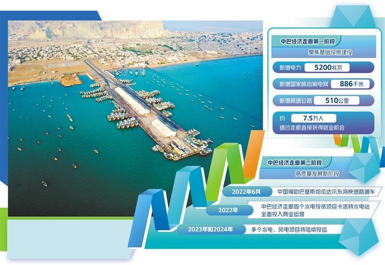當(dāng)前正處于中巴經(jīng)濟走廊建設(shè)的第二階段,這也是至關(guān)重要的高質(zhì)量發(fā)展新階段。中巴雙方在走廊框架下,進一步加強巴國工業(yè)化進程、人力資源培訓(xùn)和產(chǎn)業(yè)園區(qū)建設(shè),在扶貧、醫(yī)療、農(nóng)業(yè)以及互聯(lián)網(wǎng)等眾多與民生息息相關(guān)的領(lǐng)域持續(xù)深化合作,力求創(chuàng)造更多就業(yè)機會,不斷推動巴基斯坦的經(jīng)濟和社會現(xiàn)代化發(fā)展,造福當(dāng)?shù)孛癖姟?022年6月,中國援助巴基斯坦瓜達爾東灣快速路通車,打通了瓜達爾港和卡拉奇之間的交通運輸通道。同年,中巴經(jīng)濟走廊首個水電投資項目——卡洛特水電站全面投入商業(yè)運營,每年將向巴基斯坦提供32億千瓦時廉價清潔電能,滿足當(dāng)?shù)?00萬人用電需求,每年可節(jié)約標(biāo)準(zhǔn)煤約140萬噸,減少二氧化碳排放350萬噸。今明兩年,走廊框架下的多個水電、風(fēng)電項目將陸續(xù)投運,未來巴基斯坦在清潔能源領(lǐng)域大有可為。
