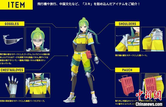 她的頭發(fā)和眼睛是綠色的,因為綠色是公司的代表色。此外,她身上有許多航空元素,護(hù)目鏡采用了飛機前窗的樣式,胸口和手套的原型是飛機的滑行道,肩膀上參考了機翼的設(shè)計,腰間還掛著一個行李箱樣式的小包。