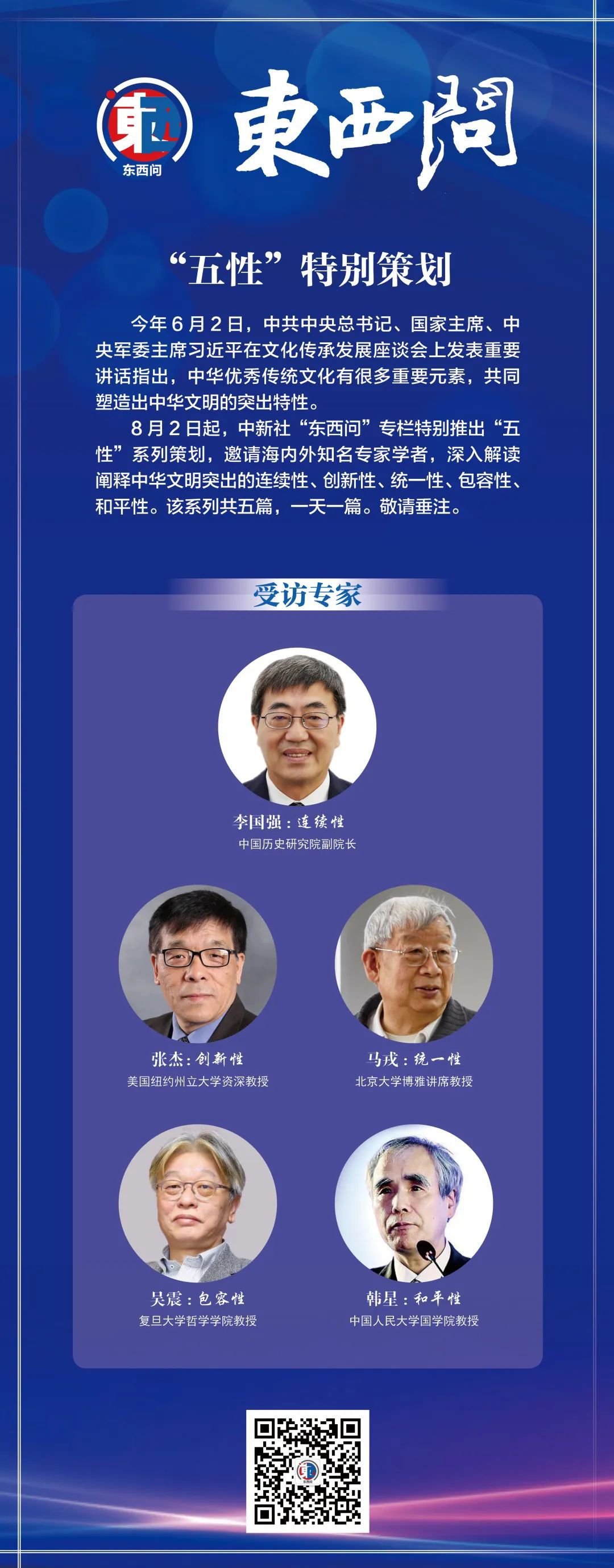 8月2日起,中新社“東西問”專欄特別推出“五性”系列策劃,邀請海內(nèi)外知名專家學(xué)者,深入解讀闡釋中華文明突出的連續(xù)性、創(chuàng)新性、統(tǒng)一性、包容性、和平性。該系列共五篇,一天一篇。敬請垂注。