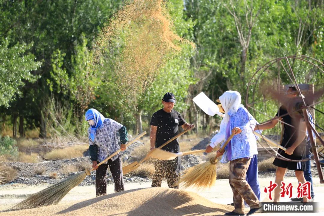 2023年7月23日,甘肅省嘉峪關(guān)市文殊鎮(zhèn)3000余畝小麥喜獲豐收,農(nóng)民搶抓晴好天氣揚(yáng)場晾曬小麥,確保顆粒歸倉。馬玉福 攝