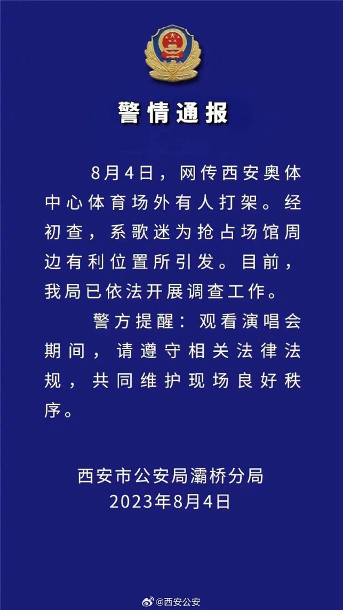 當(dāng)晚,根據(jù)網(wǎng)傳西安奧體中心體育場外打架一事,西安市公安局灞橋分局發(fā)布警情通報(bào)。