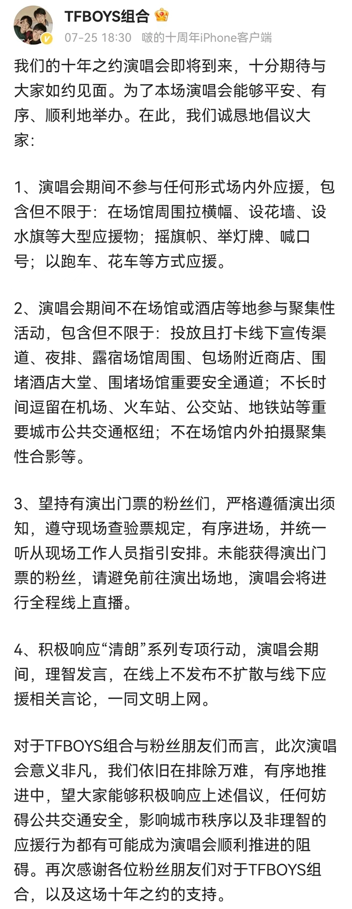 TFBOYS十年之約演唱會(huì)倡議。來源:TFBOYS官微。
