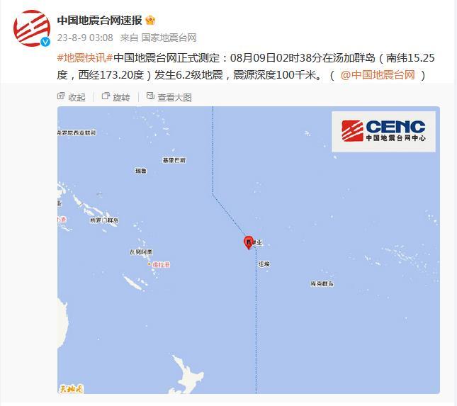 中國地震臺(tái)網(wǎng)正式測(cè)定:08月09日02時(shí)38分在湯加群島(南緯15.25度,西經(jīng)173.20度)發(fā)生6.2級(jí)地震,震源深度100千米。(國家地震臺(tái)網(wǎng)官方微博)