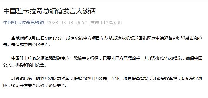 中國駐卡拉奇總領(lǐng)館強烈譴責(zé)這一恐怖主義行徑,已要求巴方嚴懲兇手,并采取切實有效措施,確保中國公民、機構(gòu)和項目安全。