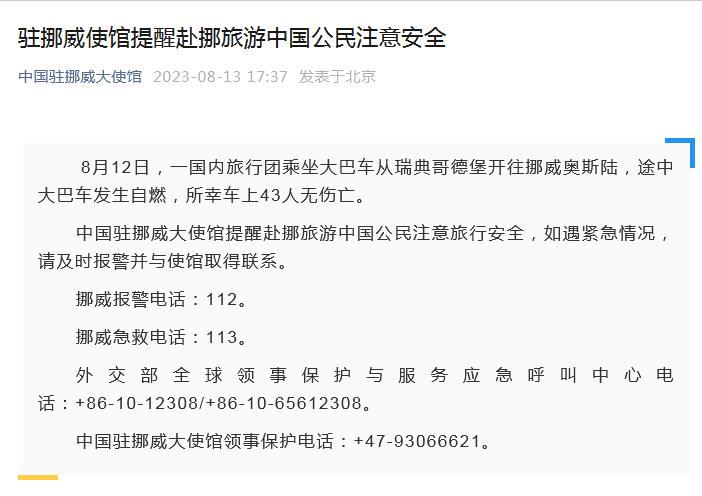 中新網8月13日電 據中國駐挪威大使館微信公眾號消息,8月12日,一國內旅行團乘坐大巴車從瑞典哥德堡開往挪威奧斯陸,途中大巴車發(fā)生自燃,所幸車上43人無傷亡。