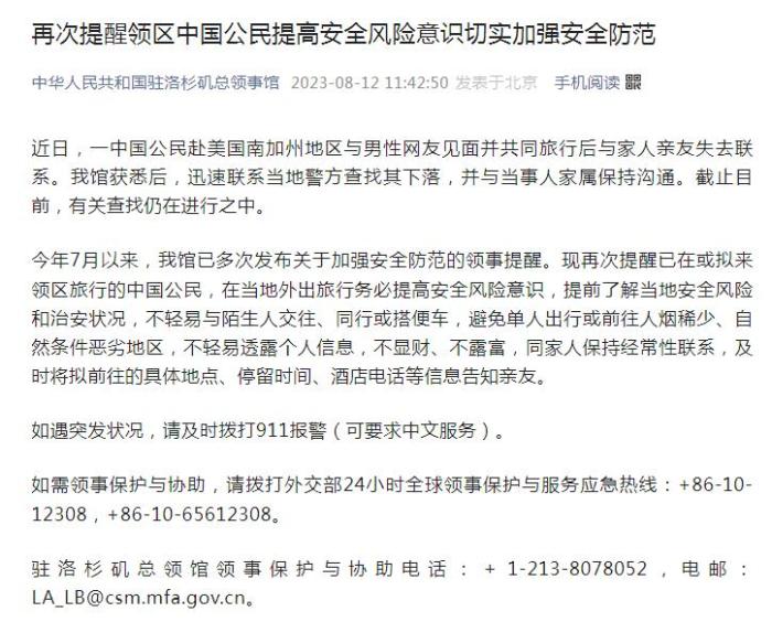 2023年7月以來,中國駐洛杉磯總領(lǐng)事館已多次發(fā)布關(guān)于加強(qiáng)安全防范的領(lǐng)事提醒?,F(xiàn)再次提醒已在或擬來領(lǐng)區(qū)旅行的中國公民,在當(dāng)?shù)赝獬雎眯袆?wù)必提高安全風(fēng)險(xiǎn)意識,提前了解當(dāng)?shù)匕踩L(fēng)險(xiǎn)和治安狀況,不輕易與陌生人交往、同行或搭便車,避免單人出行或前往人煙稀少、自然條件惡劣地區(qū),不輕易透露個(gè)人信息,不顯財(cái)、不露富,同家人保持經(jīng)常性聯(lián)系,及時(shí)將擬前往的具體地點(diǎn)、停留時(shí)間、酒店電話等信息告知親友。
