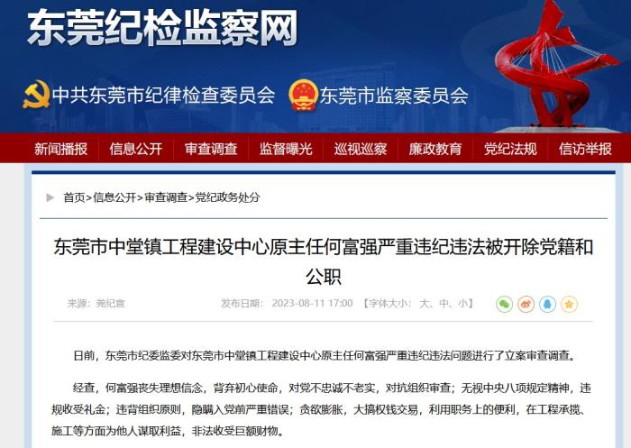 按照東莞市紀(jì)委監(jiān)委的通報(bào),何富強(qiáng)喪失理想信念,背棄初心使命,對(duì)黨不忠誠(chéng)不老實(shí),對(duì)抗組織審查;無(wú)視中央八項(xiàng)規(guī)定精神,違規(guī)收受禮金;違背組織原則,隱瞞入黨前嚴(yán)重錯(cuò)誤;貪欲膨脹,大搞權(quán)錢交易,利用職務(wù)上的便利,在工程承攬、施工等方面為他人謀取利益,非法收受巨額財(cái)物。