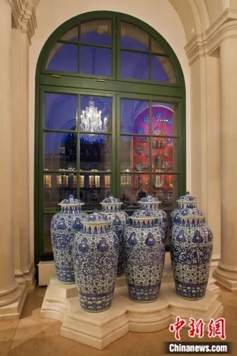 中國清朝時期的釉下藍(lán)色紀(jì)念性花瓶,即南部拱形長廊中的所謂龍騎兵花瓶。版權(quán)所有:德累斯頓國家藝術(shù)收藏館瓷器館藏。照片:Jürgen Lsel