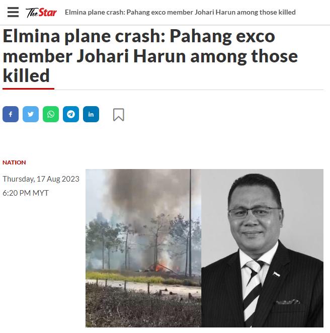 中新網(wǎng)8月17日電 據(jù)馬來西亞《星州日報(bào)》援引警方消息稱,當(dāng)?shù)貢r(shí)間17日,馬來西亞雪蘭莪州發(fā)生墜機(jī)事故,造成至少10人死亡,其中一名死者為該國彭亨州行政議員喬哈里·哈倫。