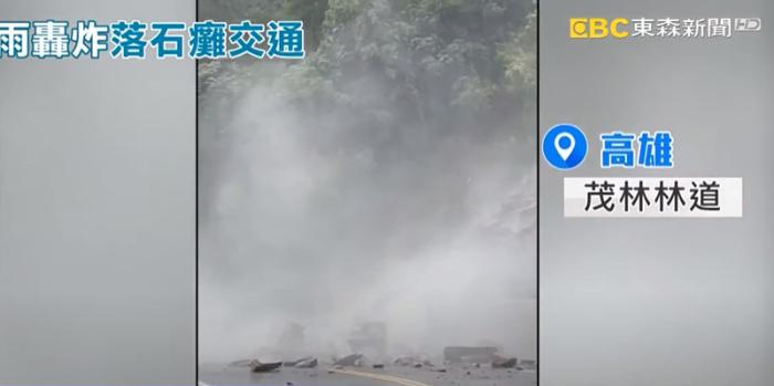 圖為臺(tái)灣高雄市遭落石的山路。 圖片來源:臺(tái)灣東森新聞網(wǎng)視頻截圖