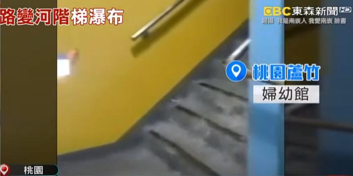 圖為臺(tái)灣桃園市蘆竹區(qū)婦女館的樓梯出現(xiàn)“小瀑布”。 圖片來源:臺(tái)灣東森新聞網(wǎng)視頻截圖
