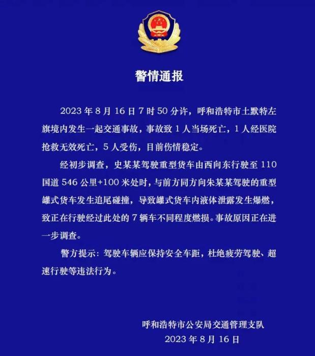 經(jīng)初步調(diào)查,史某某駕駛重型貨車由西向東行駛至110國道546公里+100米處時,與前方同方向朱某某駕駛的重型罐式貨車發(fā)生追尾碰撞,導(dǎo)致罐式貨車內(nèi)液體泄露發(fā)生爆燃,致正在行駛經(jīng)過此處的7輛車不同程度燃損。事故原因正在進(jìn)一步調(diào)查。