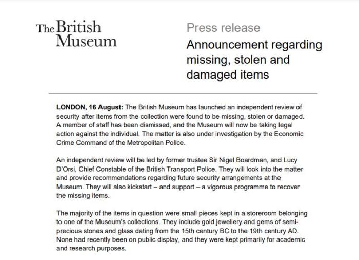 藏品丟失的具體時間沒有說明,但據(jù)大英博物館董事會董事長喬治·奧斯本表示,董事會成員在“今年早些時候”得知此事,非常擔(dān)憂。