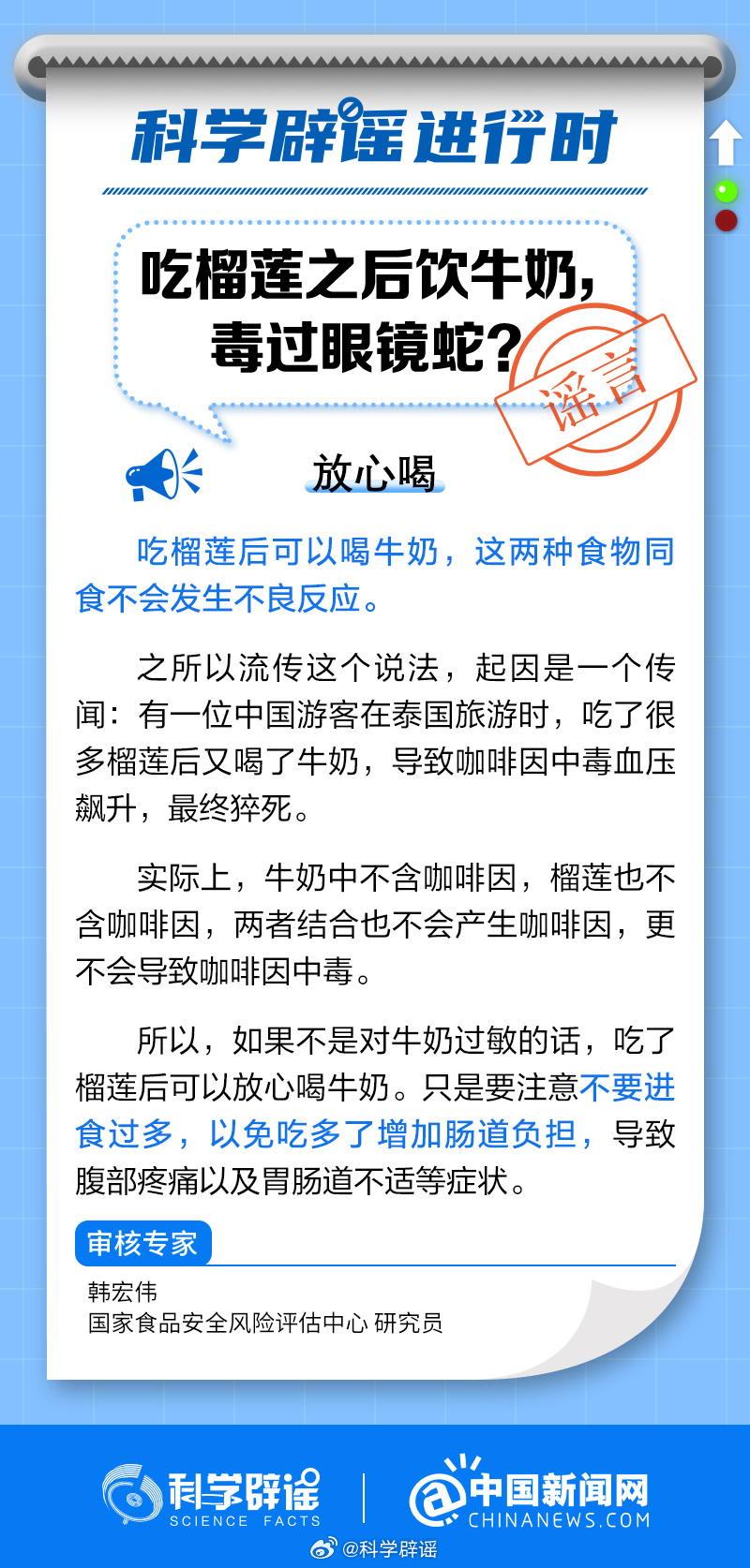中新網(wǎng)8月24日電 吃榴蓮后可以喝牛奶,這兩種食物同食不會發(fā)生不良反應(yīng)。之所以流傳這個(gè)說法,起因是一個(gè)傳聞:有一位中國游客在泰國旅游時(shí),吃了很多榴蓮后又喝了牛奶,導(dǎo)致咖啡因中毒血壓飆升,最終猝死。實(shí)際上,牛奶中不含咖啡因,榴蓮也不含咖啡因,兩者結(jié)合也不會產(chǎn)生咖啡因,更不會導(dǎo)致咖啡因中毒。(來源:@科學(xué)辟謠 @中國新聞網(wǎng) )