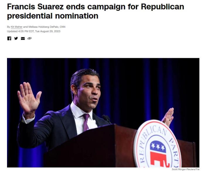 中新網(wǎng)8月30日電 綜合外媒報(bào)道,當(dāng)?shù)貢r(shí)間29日,美國(guó)邁阿密市長(zhǎng)弗朗西斯·蘇亞雷斯(Francis Suarez)宣布暫停其2024年美國(guó)總統(tǒng)競(jìng)選活動(dòng)。美聯(lián)社指出,蘇亞雷斯由此成為第一位宣布退出共和黨黨內(nèi)初選的參選人。