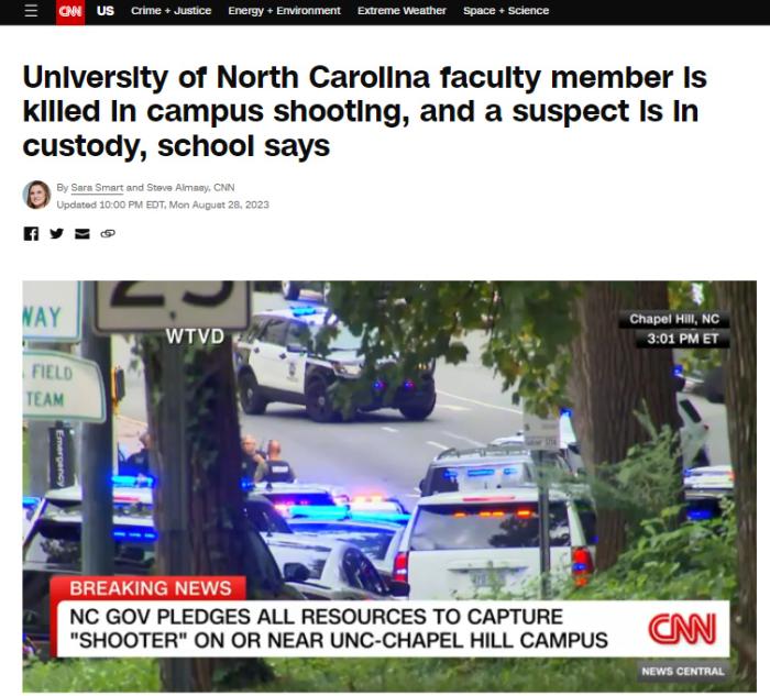 中新網(wǎng)8月29日電 綜合美媒報道,當?shù)貢r間28日,美國北卡羅來納大學教堂山分校發(fā)生一起槍擊事件,造成該校一名教職人員死亡。