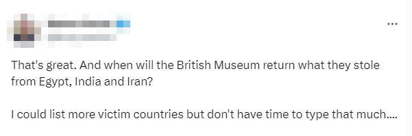 不少網(wǎng)友也在社交媒體上發(fā)文,要求大英博物館采取行動(dòng)。有人表示,“大英博物館什么時(shí)候能歸還他們從埃及、印度和伊朗偷來(lái)的東西?我可以列出更多受害國(guó)家……”