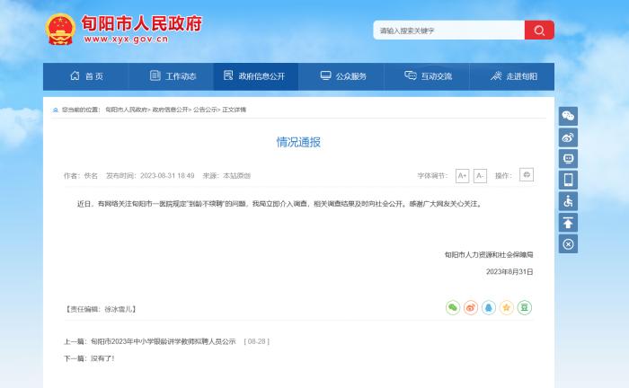 8月31日,據(jù)旬陽市人民政府網(wǎng)站發(fā)布情況通報(bào),旬陽市人力資源和社會(huì)保障局已對此介入調(diào)查,相關(guān)調(diào)查結(jié)果及時(shí)向社會(huì)公開。