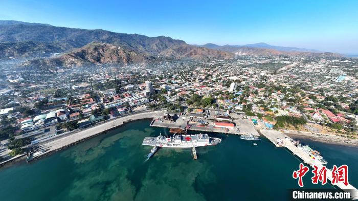 9月3日上午,正在執(zhí)行“和諧使命-2023”任務(wù)的中國海軍“和平方舟”號醫(yī)院船抵達(dá)東帝汶帝力港,開始為期7天的友好訪問和醫(yī)療服務(wù)。圖為醫(yī)院船靠泊東帝汶帝力港碼頭。桂江波 攝