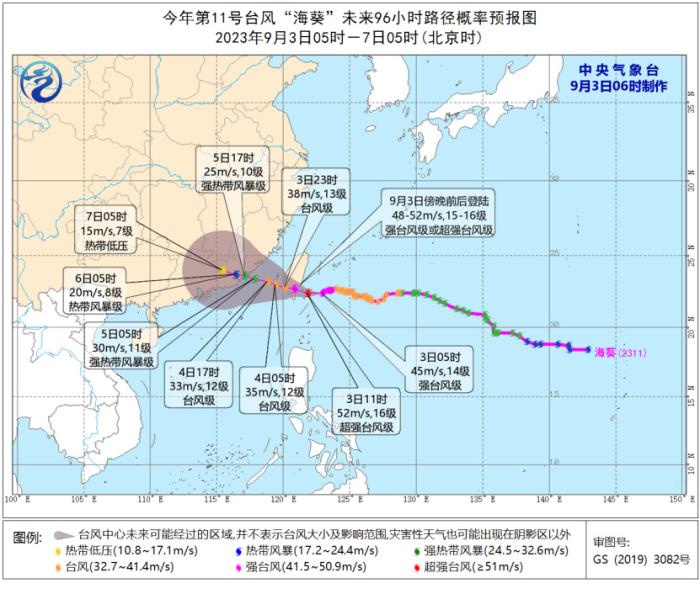 9月3日08時(shí)至4日08時(shí),內(nèi)蒙古東北部、吉林西部、廣西中南部、廣東西南部、臺(tái)灣島大部等地部分地區(qū)有中到大雨,其中,廣西中部、臺(tái)灣島中東部等地部分地區(qū)有暴雨或大暴雨,臺(tái)灣島東部部分地區(qū)有特大暴雨(250~600毫米)。浙江東南部、福建東部沿海部分地區(qū)有5~7級(jí)風(fēng)。北部灣、瓊州海峽、東海南部、臺(tái)灣以東洋面、臺(tái)灣海峽、巴士海峽、南海東北部有6~8級(jí)大風(fēng)、陣風(fēng)10~11級(jí),其中臺(tái)灣以東洋面、臺(tái)灣海峽、巴士海峽北部、南海東北部部分海域風(fēng)力可達(dá)9~11級(jí)、陣風(fēng)13~14級(jí)。
