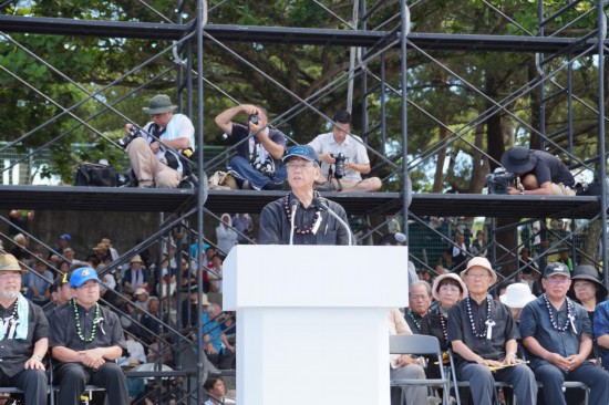 2016年6月19日,在日本沖繩縣首府那霸市一座公園內(nèi),時(shí)任沖繩縣知事翁長(zhǎng)雄志(前)發(fā)表講話(huà)。新華社記者沈紅輝攝