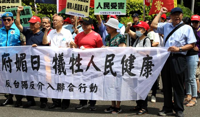 9月6日,臺灣數(shù)十個政黨和團體組成的反“臺獨”反介入聯(lián)合行動在臺北集會,抗議日本將核污染水排入海洋,要求民進黨當(dāng)局嚴(yán)禁從日本核污染地區(qū)進口食物。圖為抗議現(xiàn)場。