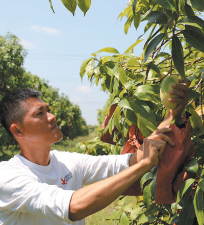 柬埔寨磅士卑省一個(gè)芒果園內(nèi),果園主管布南正在細(xì)致檢查芒果長勢(shì)。該果園生產(chǎn)優(yōu)質(zhì)芒果,遠(yuǎn)銷至中國、俄羅斯、日本和韓國。