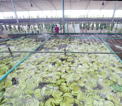 柬埔寨磅湛省的地澤香蕉園加工廠內(nèi),巨大的清洗池里滿是剛剛采摘下來的香蕉。這些香蕉將運(yùn)往中國銷售。