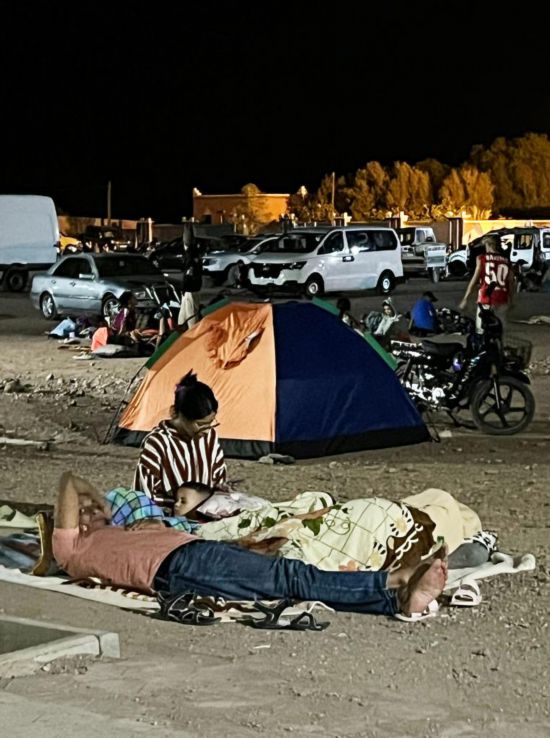 抵達(dá)目的地瓦爾扎扎特,已是9日凌晨1時左右。記者看到,許多當(dāng)?shù)孛癖娫隈R路上席地而眠。4名結(jié)伴的當(dāng)?shù)厍嗄旮嬖V記者:地震發(fā)生時大家都很害怕,紛紛來到廣場上,因?yàn)閾?dān)心余震,今晚就打算這樣過夜了。