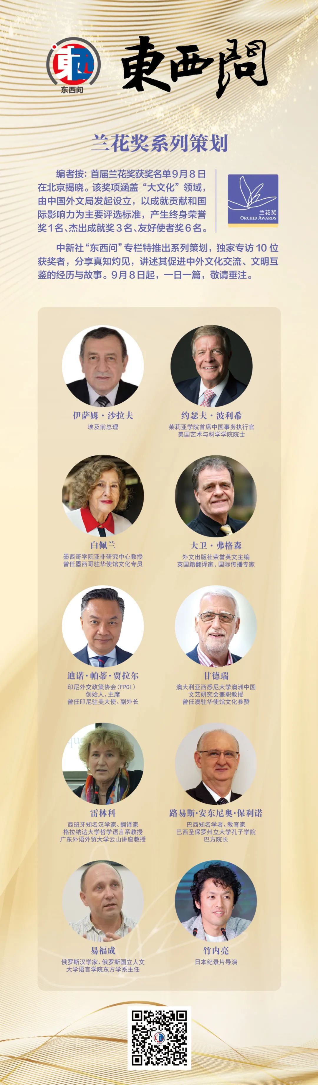 中新社“東西問”專欄特推出系列策劃,獨家專訪10位獲獎?wù)?,分享真知灼見,講述其促進中外文化交流、文明互鑒的經(jīng)歷與故事。9月8日起,一日一篇,敬請垂注。