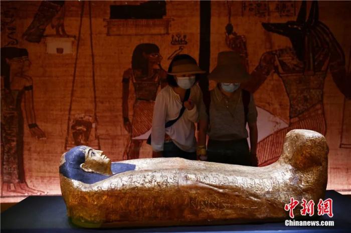 2022年8月18日,“遇見古埃及-木乃伊大型文物特展”在遇見博物館·成都館開展,全身鍍金木乃伊棺槨吸引參觀者。攝