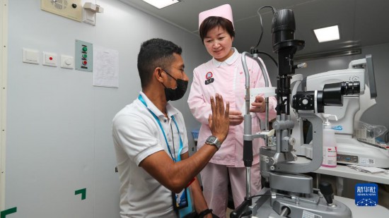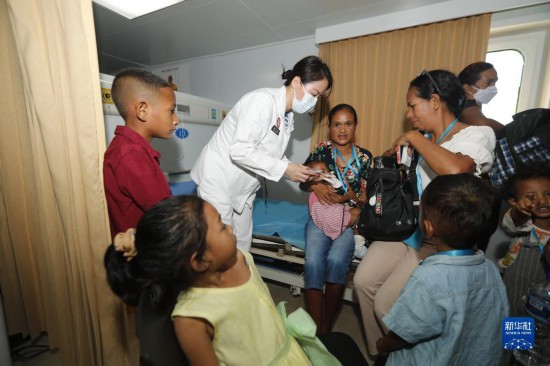 中國海軍“和平方舟”號(hào)醫(yī)院船訪問東帝汶并開展醫(yī)療服務(wù)期間,醫(yī)院船醫(yī)護(hù)人員為當(dāng)?shù)孛癖娞峁┽t(yī)療服務(wù)(9月8日攝)。新華社發(fā)(黎宇 攝)