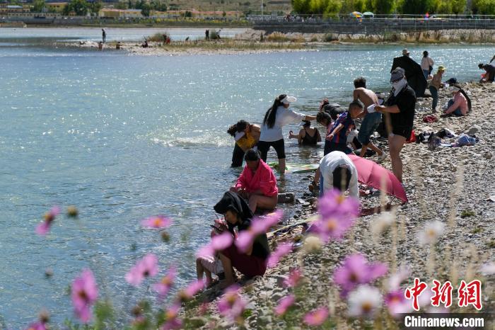 中新社拉薩9月10日電 (記者 江飛波)9月10日是藏歷七月二十六,恰逢周末,西藏民眾迎來傳統(tǒng)沐浴節(jié)第二天。拉薩河畔格桑花叢中傳出陣陣嬉笑打鬧聲,不少藏族家庭舉家在河畔或梳洗、游泳、跳水、日光浴,或是在河畔一邊閑話,一邊煮著甜茶、牦牛肉等,享受愜意的沐浴節(jié)時(shí)光。