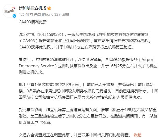 中新網(wǎng)北京9月10日電 據(jù)新加坡樟宜機(jī)場(chǎng)官方微博消息,2023年9月10日15時(shí)59分,一架從中國(guó)成都飛往新加坡樟宜機(jī)場(chǎng)的國(guó)航航班(CA403)報(bào)告前貨倉(cāng)和衛(wèi)生間出現(xiàn)煙霧,宣布緊急情況并要求降落優(yōu)先權(quán)。CA403獲得優(yōu)先權(quán), 并于16時(shí)15分左右降落于樟宜機(jī)場(chǎng)第三跑道。