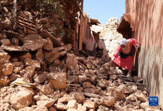 9月11日,在摩洛哥馬拉喀什南部的穆萊村,一名婦女走過地震廢墟。新華社記者王東震攝