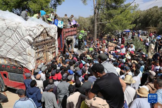 9月11日,救援人員在摩洛哥馬拉喀什南部的艾米茲米茲村分發(fā)救災(zāi)物資。新華社記者王東震攝