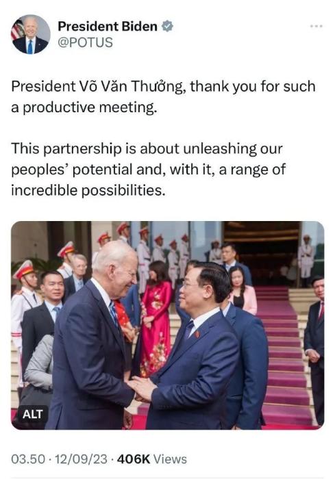 在這條發(fā)布在美國(guó)總統(tǒng)官方賬號(hào)上的帖子里,拜登為“富有成效的會(huì)議”向武文賞(Vo Van Thuong)表示感謝。然而,配發(fā)的圖片中并沒(méi)有出現(xiàn)武文賞,而是放了拜登和越南國(guó)會(huì)主席王庭惠(Vuong Dinh Hue)握手的照片。這條帖子目前已被刪除。