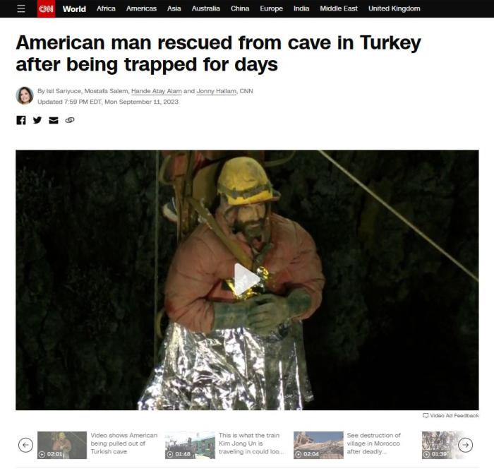 中新網(wǎng)9月12日電 綜合外媒報(bào)道,當(dāng)?shù)貢r(shí)間12日凌晨,被困在土耳其一處地下洞穴1000多米深處多日的美國(guó)洞穴探險(xiǎn)家馬克·迪基,被成功救出。