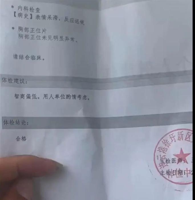 9月12日,有網(wǎng)友發(fā)布一則體檢報告視頻,內(nèi)科檢查一欄寫著“(病史)表情呆滯,反應(yīng)遲鈍”字樣,而在體檢建議一欄則寫著“智商偏低。用人單位酌情考慮”的內(nèi)容,而在胸部拍片一欄則完全正常,最終的體檢結(jié)論也是合格。
